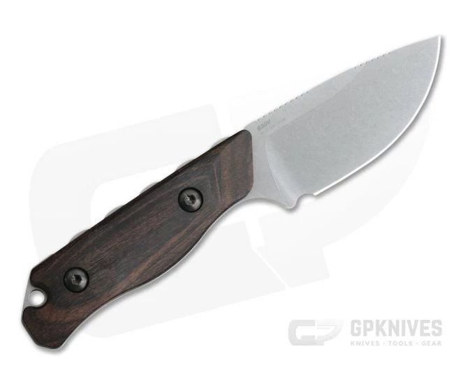 Handle: Warm, comfortable, stabilized wood handles are durable and weather resistant. Attached to the full tang blade with black hardware, the scales are contoured for comfort and ergonomic use with ramps down to the blade for added comfort in a forward pinch grip. Compact and lightweight this design is well suited to backcountry use where every ounce counts. Wide jimping on the spine provides added traction in adverse conditions and a hole at the pommel provides a lanyard attachment point.
