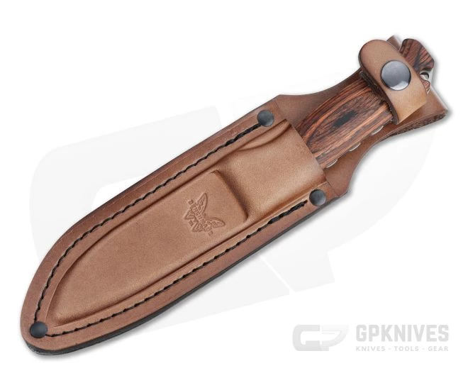 The Benchmade Hunt Series 15002 Saddle Mountain Skinner is an upgraded big game hunting knife with improvements based on in-field feedback. The full tang CPM-S30V stainless steel blade retains the wear hiding stonewashed finish and saber ground, drop point profile that excels at processing game as well as being a useful utility knife for basic field and campsite tasks. A stabilized wood handle offers modern performance with a classic look and feel. Improvements include adjusted jimping location, enhanced ergonomics and blade profile with an updated sheath design for enhanced retention.