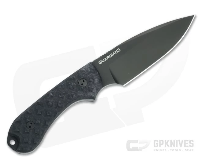 The Bradford Guardian3 is a compact, American made, everyday carry fixed blade that makes a perfect belt-carry companion for urban or outdoor use. Built to replace the modern EDC folding knife, the Guardian3 has a compact size that is easy to carry while still providing plenty of edge for your cutting needs. This GPKnives Exclusive has a false edge blade of black DLC coated CPM Rex 45 tool steel and black G10 handle scales.