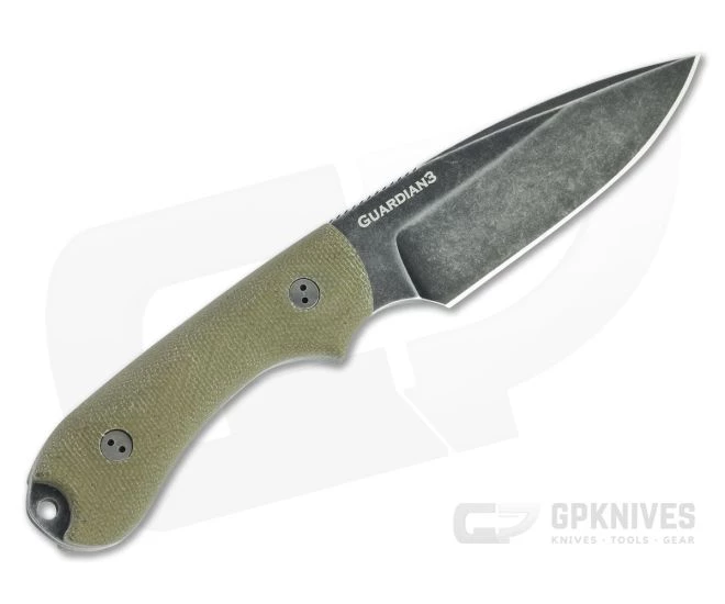 The Bradford Guardian3 is a compact, American made, everyday carry fixed blade that makes a perfect belt-carry companion for urban or outdoor use. Built to replace the modern EDC folding knife, the Guardian3 has a compact size that is easy to carry while still providing plenty of edge for your cutting needs. This GPKnives Exclusive has a false edge blade of Nimbus finished CPM Rex 45 tool steel and 3D contoured OD Green canvas Micarta handle scales.
