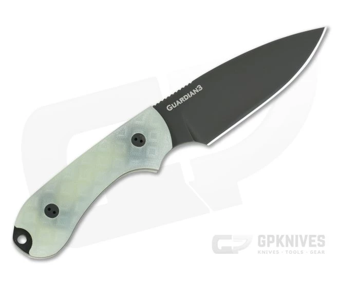 The classic Guardian3 fixed blade from Bradford Knives comes with thick, textured G10 scales and a robust sabre ground M390 blade for exceptional everyday carry performance. The 3 is the perfect size to EDC or throw in your pack. It won’t weigh you down and offers plenty cutting edge to handle daily tasks. This version comes with a black DLC finish and translucent jade green or “Ghost” G10 scales.