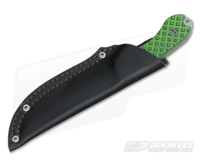 The Handle:Â Thick removable/interchangeable Toxic green/black layered G-10 handle scales are heavily diamond-textured for a sure grip in any environment. They are secured to the tang via 416 stainless custom fasteners heat treated to 40 Rc and dark tumbled.