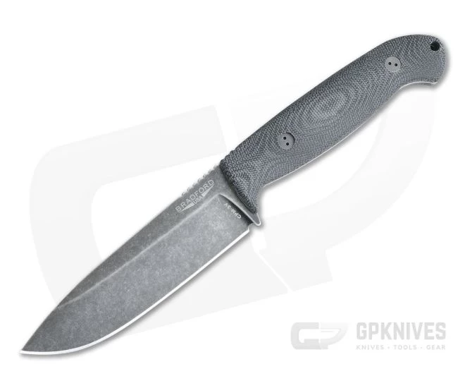 The Guardian5.5 from Bradford Knives is a custom fixed blade built to handle every task from Bushcraft to the battlefield. The G5.5 blends the design of the G4.5 Bushcrafter with the larger size of the G5 delivering good length and weight for chopping and martial use. This design forgoes the iconic Bradford finger choil, replacing it with a full, 3D contoured handle that provides a variety of comfortable grip options This version comes in tough, wear resistant CPM-3V tool steel, a favorite among outdoor enthusiasts, with the Bradford Nimbus finish and 3D Black Canvas Micarta with black oxide stainless steel hardware.