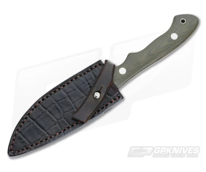 The Handle: The full tang construction tapers from nearly a quarter inch thickness in the center of the knife down to around 1⁄10” delivering a very fast, well balanced blade. Contoured and polished Green Canvas Micarta are very comfortable and handsome. The ergonomic handle design offers a secure, comfortable grip during use.