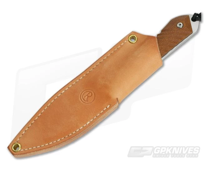 The Handle: Natural canvas micarta scales are attached to the tang with Allen screws. Contoured and given machined grooves on each side ensure the most solid of grips in all weather conditions. The handle thins a bit as it reaches the butt end where it expands for the integral lanyard hole and attached lanyard. A forward guard keeps the index finger out of harm’s way.