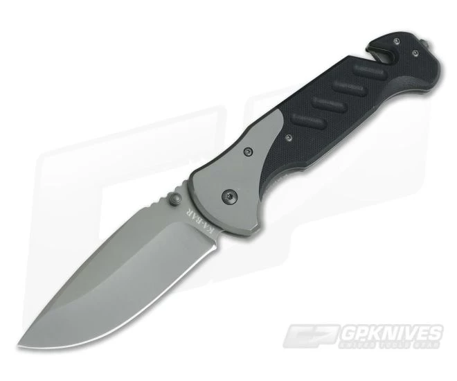 The Coypu liner lock folding knife from Kabar Knives is a robust and multifunctional utility folder. A hollow ground, stainless steel blade is augmented with a built in emergency web cutter and hardened steel glass breaker in the handle. Black G10 scales over the stainless steel liners deliver traction and durability when it counts.