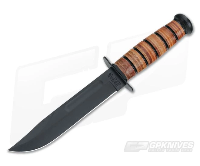 Kabar USMC Knife with black coated plain edge 1095 Cro-Van blade and leather wrapped handle. Stainless steel butt cap and guard. Brown leather belt sheath.