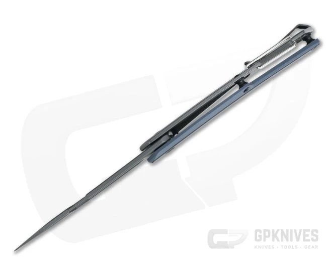 The Handle: Blue-gray G10 frontside with handsome carbon fiber front overlay and carbo-nitride coated stainless steel framelock back, the handle features a slimline design without sacrificing comfort. This is a nice combo that makes accessing the frame lock cutout simple.