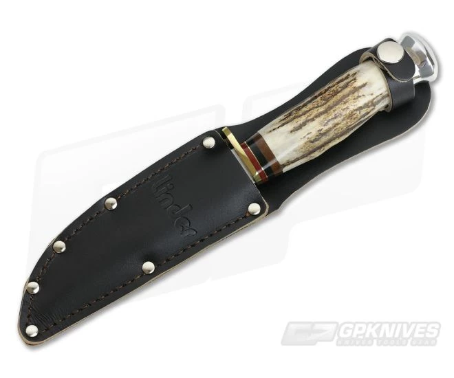 Linder Large Traveller with one piece genuine stag handle and aluminum pommel. German made Bowie blade of 420 stainless steel with a machined satin finish. Multi piece handle has a brass guard and is tensioned with a brass nut recessed into the aluminum pommel. Includes a riveted and sewn brown leather belt sheath with snap strap.