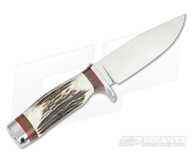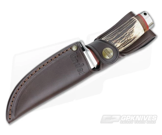 Linder Mark I traditional drop point hunting blade with stag handle. Multi piece handle has a stainless steel guard and one piece of round stag with aluminum pommel. Made in Germany knife has excellent fit and finish with a lanyard hole drilled into the pommel. The over four inch blade has plenty of cutting edge for most tasks and the full flat ground blade makes a great slicer. Includes a brown leather belt sheath with snap strap.