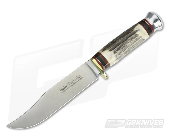 Linder Extra Large Traveller with one piece genuine stag handle and aluminum pommel. German made Bowie blade of 420 stainless steel with a machined satin finish. Multi piece handle has a brass guard and is tensioned with a brass nut recessed into the aluminum pommel. Includes a riveted and sewn brown leather belt sheath with snap strap.