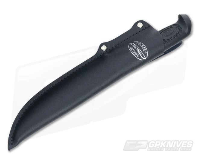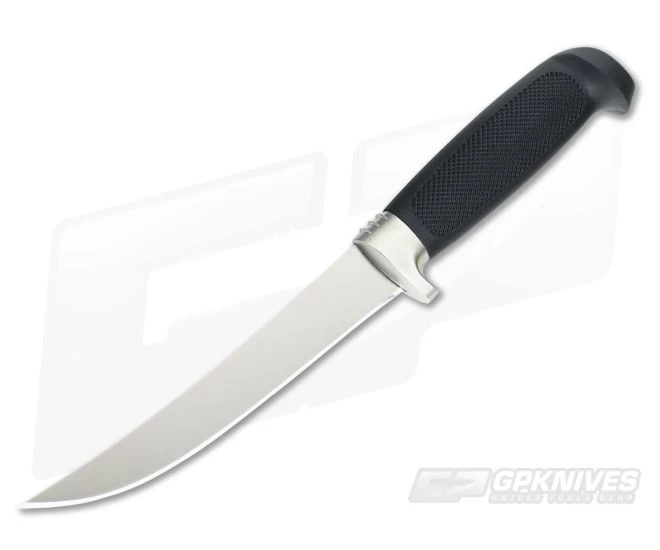 The Marttiini Jahtiveitsi is a semi rigid hunting knife that has a 6″ long trailing point blade. Grippy rubberized handle provides great all weather use and features a metal finger guard for protection. Inox Stainless steel blade has a satin finish and a polished edge. Includes leather sheath with belt loop.