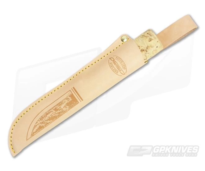 The Arctic Carving Knife is a traditional carving knife that is suitable for use by tradesman or hunters and campers. The Carbinox T508 blade is more corrosion resistant than traditional carbon steels due to the 8% chromium content and is simple to maintain, just dry between uses and oil with unsalted oil on a regular basis. Being a carbon steel, it still has the toughness, ease of sharpening and durability that is expected. Natural birch wood handle keeps you in control of the knife. Includes a stitched light tan leather sheath with attached belt loop.