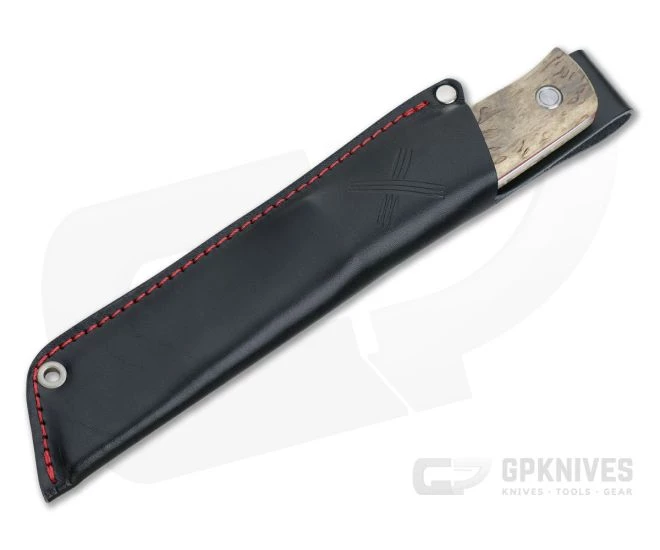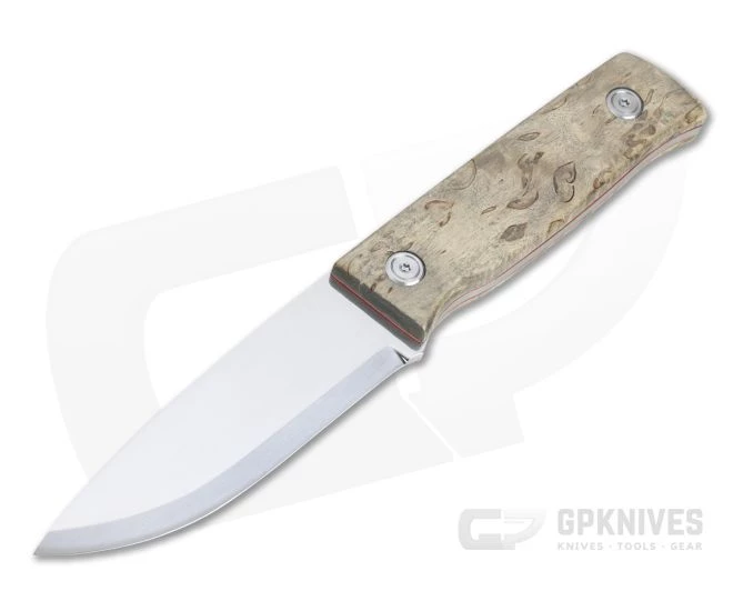 Handle: Thick slabs of waxed curly birch are attached to the full tang over contrasting red liners via stainless steel Torx T10 hardware. The relatively flat scales are chamfered for comfort while being surprisingly secure in multiple grip positions for the versatile required of a bushcraft knife. Driftwood gray Finnish curly birch offers a handsome, subdued look with solid outdoor performance and is waxed for added weather resistance.
