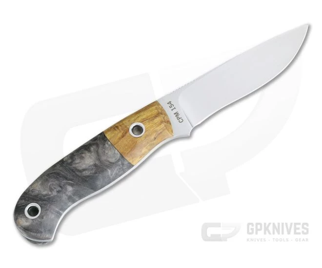The Mike Irie Custom Model 110 lightweight Hunter is an ideal size for hunting, woodcraft or daily carry or as a mid-sized fixed blade for any collection. Mike Irie is renowned for his hand ground blades and his Custom Model 110 showcases his skill and attention to detail. This piece comes with a hand rubbed satin finished blade of CPM-154, maple bolsters and dyed stabilized Buckeye Burl Wood handles.