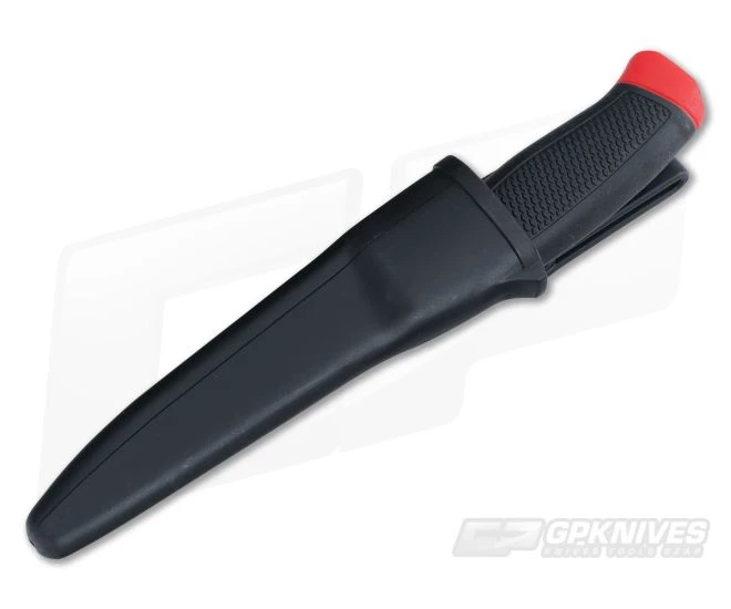 Mora of Sweden Clipper 840 utility fixed blade knife with a black rubberized checkered handle and scandi-ground Swedish carbon steel blade. The ergonomic handle has red composition trim and comes in a black molded sheath with belt clip and water drainage hole. Great for your pack, tackle box or tool shed.