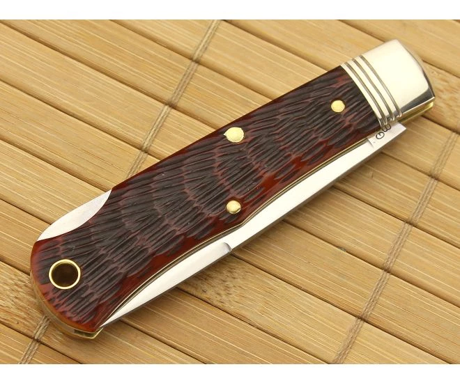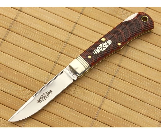 Northfiled #83LB Tascosa Little LockBack pattern is a single blade folder with pretty reddish orange Autumn Leaf Jigged Bone handle scales and a dependable lock back mechanism. This Tascosa has one drop point polished 1095 carbon steel blade attached to a single nickel silver bolster. The Tascosa is lightweight, thin and smooth functioning that is perfect for daily carry. Put together with traditional pocket knife techniques where the handle scales are pinned to the brass liners. Includes brass lined lanyard tube and a pinned “UN-X-LD” traditional shield. Each knife comes in unique tube packaging with company information on the front. Brand new direct from Great Eastern Cutlery.