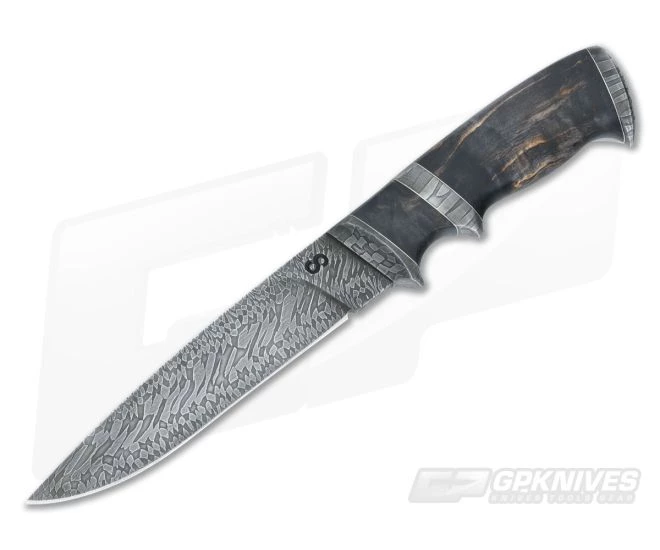 The Olamic Cutlery Suna is an exquisite custom specimen crafted using hand-forged and shaped marbled damascus and eye-catching Karelian Birch Wood handles. Comfortable in hand and well balanced, this beauty not only offers a remarkable appearance but also performs exceptionally as a utility fixed blade.