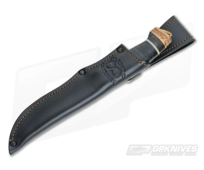The Handle:Â Â Contoured and black stacked leather fill the palm of the knife with moonglow and Wenge Wood ring accents on each end. Decorative cast bronze bolster and pommel with lanyard ring on end complete the look and feel of this handmade piece.