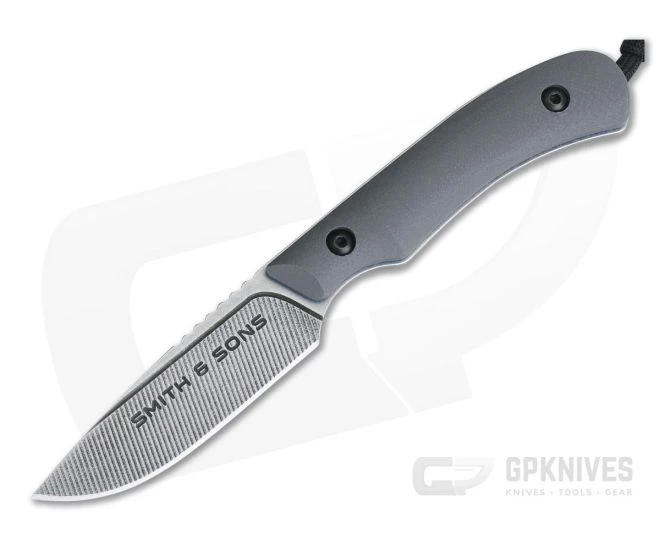 The Axiom from Smith & Sons is a compact, every day carry sized fixed blade CNC machined from high performance AEB-L stainless steel entirely in-house. Smith & Sons designed the Axiom to be a highly versatile, utilitarian cutting tool that is comfortable to carry and use making it a perfect choice for EDC. 700 different blade/handle/liner/hardware configurations are available and handle and liner combos can be purchased separately for ultimate customization. This version comes with Charcoal Gray G10 handles, blue liners and black steel hardware.