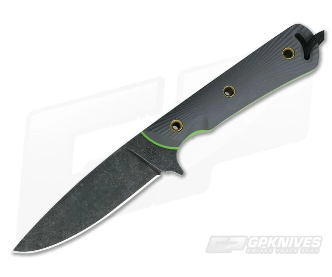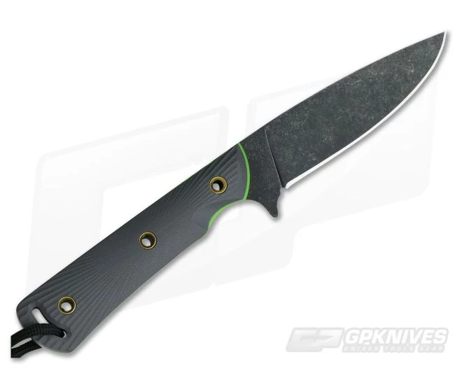 The Handle: Sunburst milled Charcoal Gray G10 scales are attached with flared brass pins for a very secure construction. The scales are attached over Toxic Green liners which add a visual interest as well as making the knife easier to find in adverse conditions. The scales are shaped and contoured for a great and comfortable in-hand feel while still being comfortable in a variety of grips. The handles are clean, contoured and refined with lots of details that give excellent control and security during use: Sunburst milled texture, angled finger grooves, subtle pommel swell and unique lanyard groove. The hollow brass pins offer lashing points as well as alternative lanyard options.
