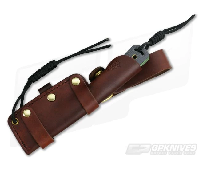 The Sheath: Includes a Brown leather adventure carry sheath system set up for right hand carry. Included in the system is a scout carry sheath with removable leather dangler loop and Ferro rod holder.