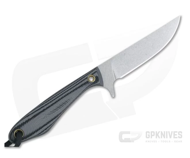 Handle:Â Layered Gray & Black G10 scales are supported by the full tang construction and paired with the pommel swell handle design gives this small knife a big in hand feel. Doppler milled textured on the handles adds traction and offers an appealing style. The Spur is comfortable enough for serious, extended use. Dual flared brass pins hold the scales securely and provide attachment points for lashing or lanyards, one of which is included at the pommel end which helps to draw the knife from the sheath.