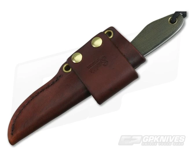 Handle:Â OD Green Canvas Micarta scales are supported by the full tang construction and paired with the pommel swell handle design gives this small knife a big in hand feel. The Spur is comfortable enough for serious, extended use. Dual flared brass pins hold the scales securely and provide attachment points for lashing or lanyards, one of which is included at the pommel end which helps to draw the knife from the sheath.