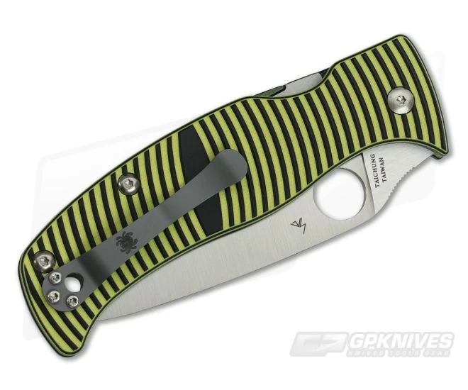Handle:Â The handles of the Caribbean Salt are built on a skeletonized stainless steel liner framework. The liners are nested into the layered G10 handles and one liner forms the unique Compression Lock mechanism that is rock solid and easy to operate. The scales are made from Yellow and Black layered G10 with a milled texture for grip as well as an eye-catching striped coloration.