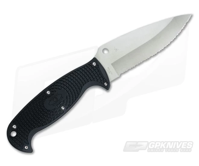 The blade: Hollow ground and fully serrated to handle a wide variety of cutting duties. The blade rises from the handle and has the familiar Spyderco Trademark hole at the thumb ramp.