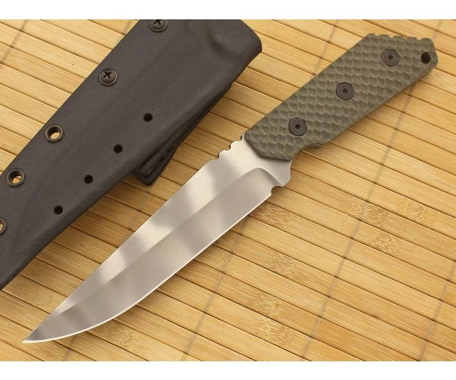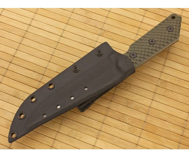 This Strider MK1C is in the medium length fixed blade class with an under six inch blade. It has a handle that is based off the MK1 series and features a long drop point blade. The knife has a full tang construction with bolt-on scales. Deep jimping provides traction for the thumb in both reverse and forward grips. An awesome Ghost Striped blade effect is sure to gather attention while the hollow grind helps provide a razor sharp edge. Gunner Grip bolt-on G10 handle scales are attached with three Torx screws and are slightly contoured. Handle also has a lanyard hole drilled through the tang. Includes Kydex sheath with an attached large Tek-Lok. Brand new direct from Strider Knives.