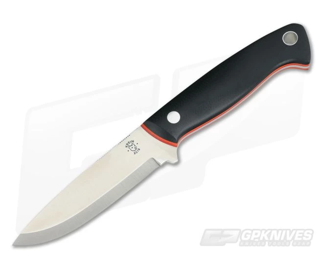 The Handle:Â The handles are clean, ergonomic and secure in the hand. The black G10 is blasted for a semi-matte finish and fine texture. A gently contoured palm swell fills the hand and creates an ergonomic grip in multiple positions. The black contrasts nicely with the bright orange and red G10 liners. An aluminum pin and a lanyard tube secure the handles to the full tang of the blade.