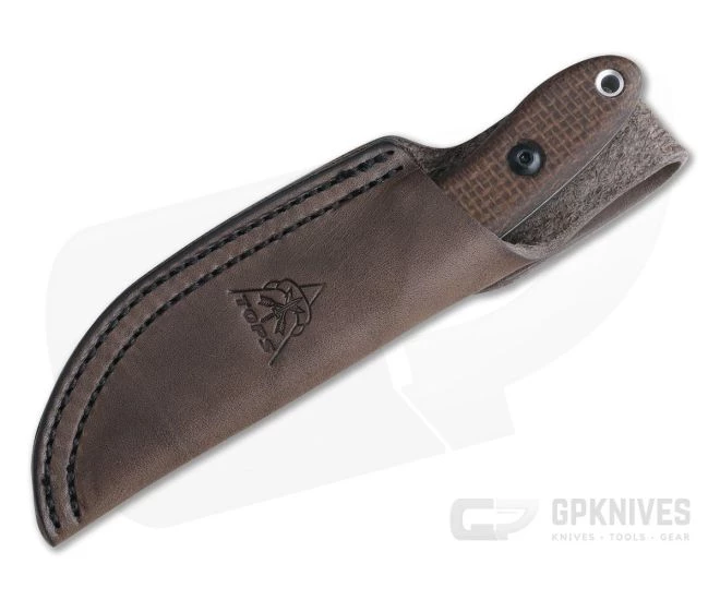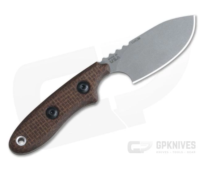Handle: Brown Burlap Micarta handle scales are ergonomically designed and contoured to comfortably fill the hand for a secure grip. They are connected to the handle via Black Allen screws and a hollow lanyard tube. A deep index finger cutout and thumb scallops at the blade offer added security and control for fine work.