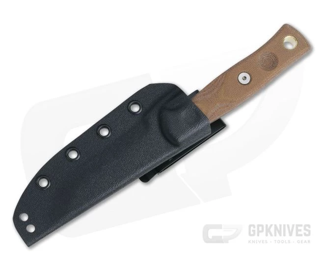 Handle: Brown Canvas Micarta handle scales are ergonomically designed and contoured for comfort. They are connected to the handle via stainless steel Allen screws and a hollow brass lanyard tube. The handle also features a bow drill divot for making primitive type fires, and thumb scallops at the blade for a more controlled grip when carving or skinning.
