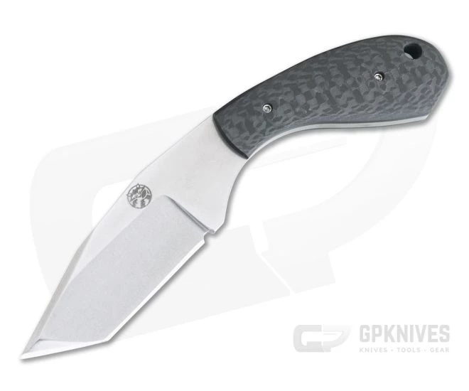 Handle:Â The full tang blade supports a rugged, blasted Carbon Fiber handle scales. The handles are canted downward from the blade delivering a secure, three-finger “pistol” grip. A large hole is provided for lanyard attachment.